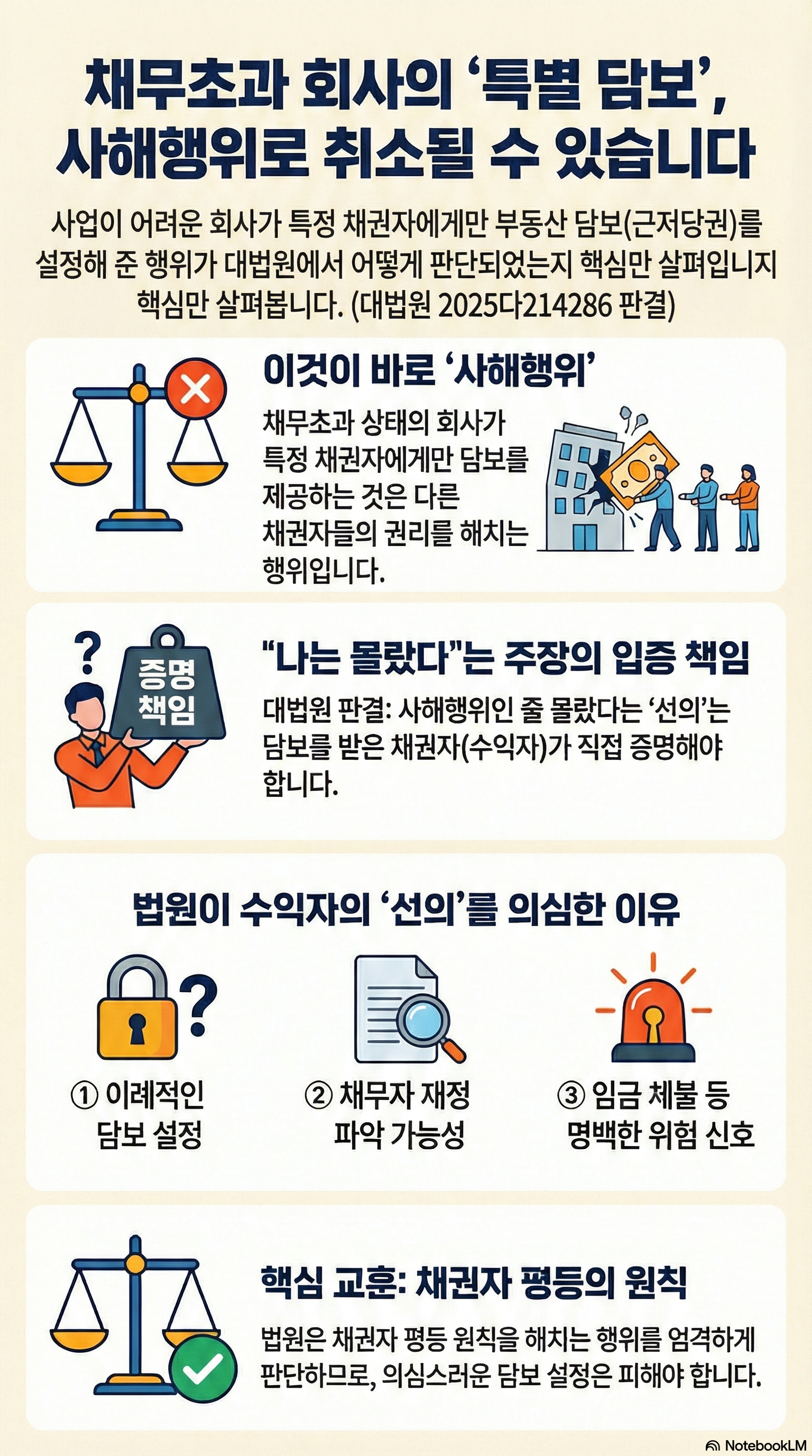 이번 판결은 채권자 평등의 원칙을 해치는 담보 제공 행위에 대해 법원이 얼마나 엄격하게 판단하는지를 잘 보여줍니다. 특히 수익자가 기관이거나 채무자의 상태를 파악할 수 있는 지위에 있다면 ‘몰랐다’는 변명만으로는 부족합니다.