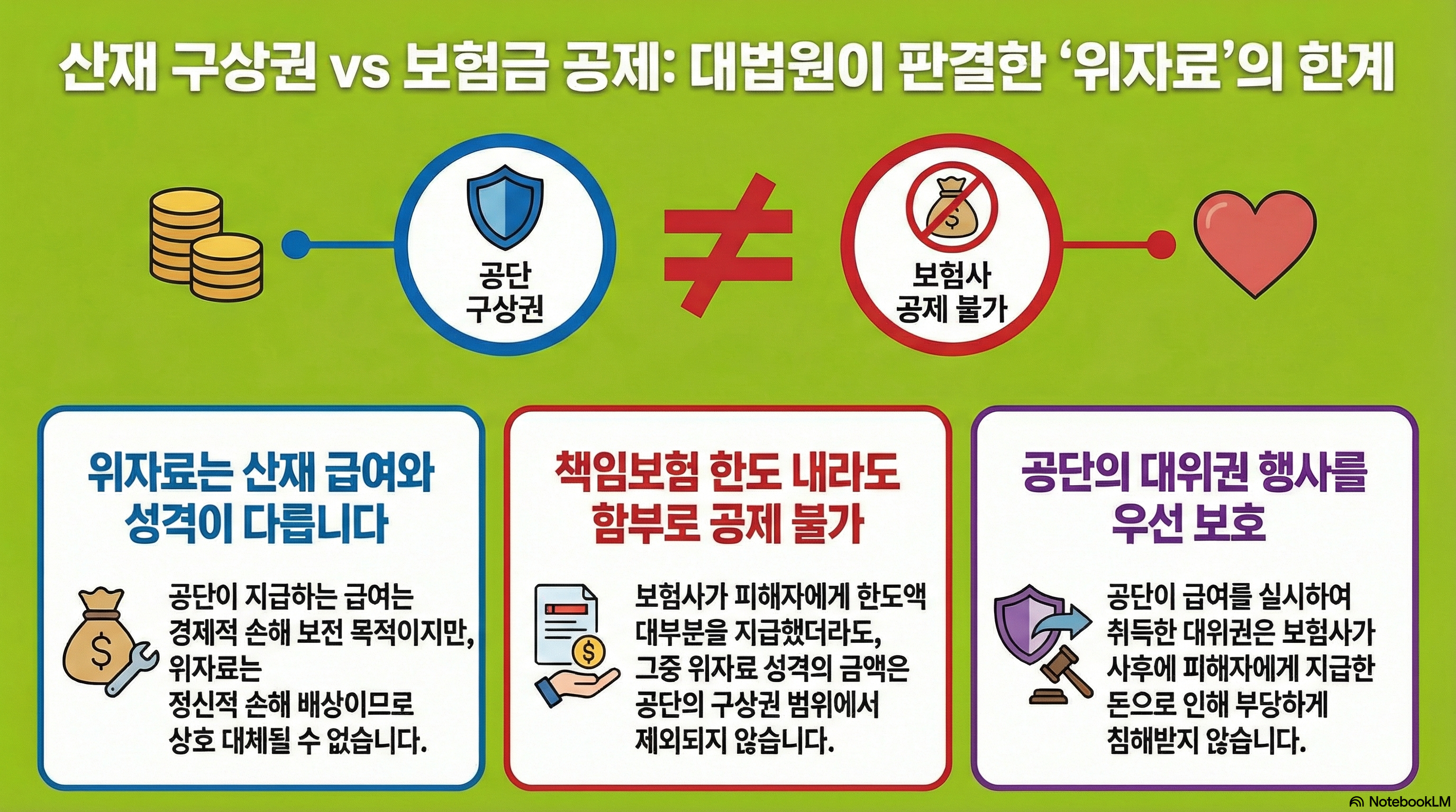 - 상호보완적 관계의 고려: 공단이 대위할 수 있는 범위는 '보험급여와 동일한 사유'에 의한 손해배상채권으로 한정됩니다. 즉, 위자료처럼 산재 보험급여와 성격이 다른(상호보완적이지 않은) 부분은 별개로 취급되어야 합니다.