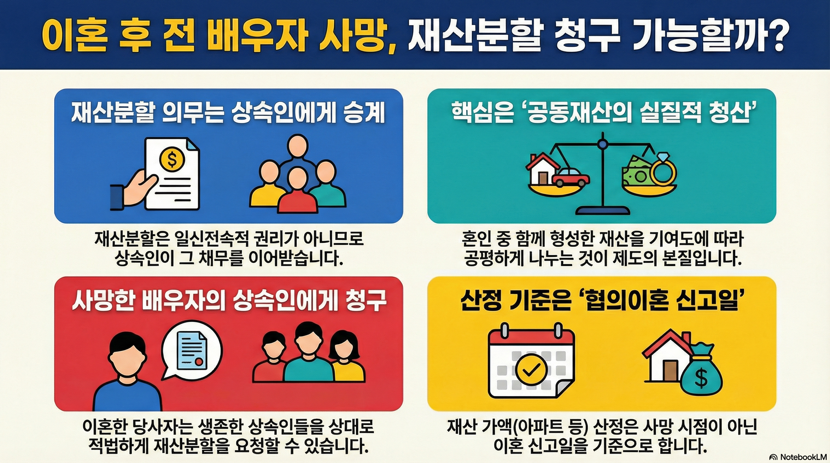 이번 대법원 결정은 상대방이 사망하더라도 혼인 기간 중 내가 기여한 몫에 대한 정당한 권리(재산분할청구권)는 사라지지 않는다는 점을 분명히 했습니다.