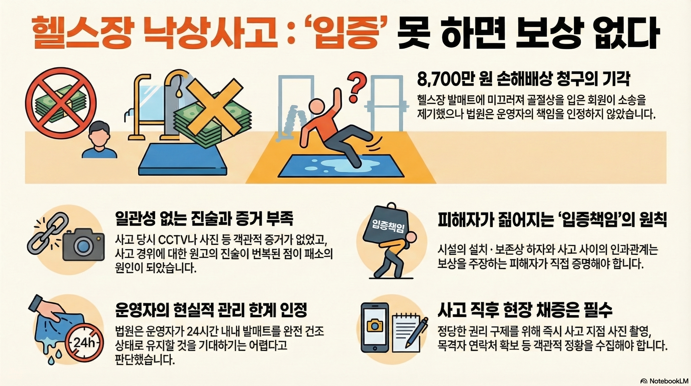 재판부는 원고가 해당 헬스장에서 넘어져 부상을 입고 후송된 사실 자체는 인정했습니다. 그러나 결과적으로 원고의 청구를 기각했습니다. 법원이 운영자의 책임을 묻지 않은 핵심 이유는 '객관적 증거의 부족'과 '입증책임의 원칙'에 있었습니다.